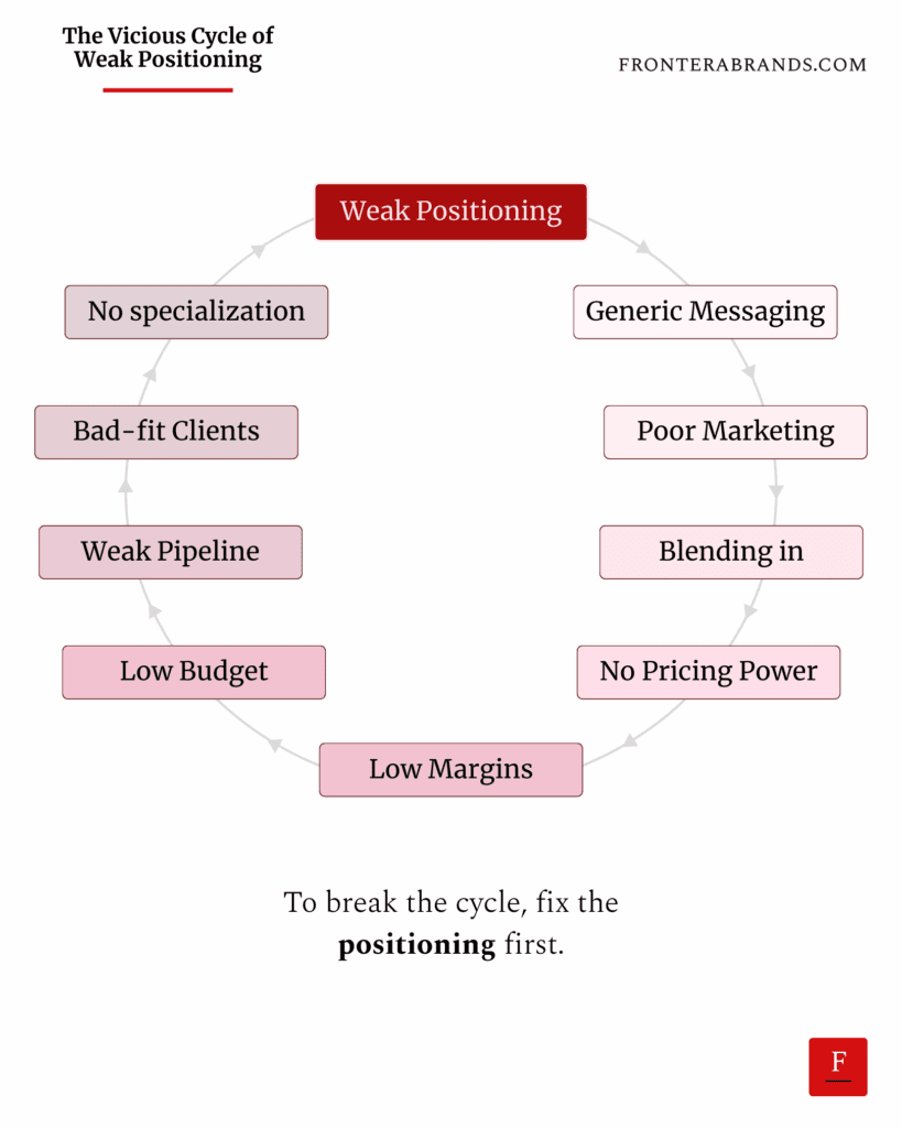 Weak positioning causes a vicious cycle for every firm. It goes like this: You lack clarity around your ideal client profile, the specific problem you solve for them, and how you solve it differently. That causes you to have generic messaging. That causes your website, content, and ads to get ignored. That causes buyers to see you as interchangeable with hundreds of other firms. That causes you to lack pricing power. That causes you to have low margins. That causes you to have a low budget...