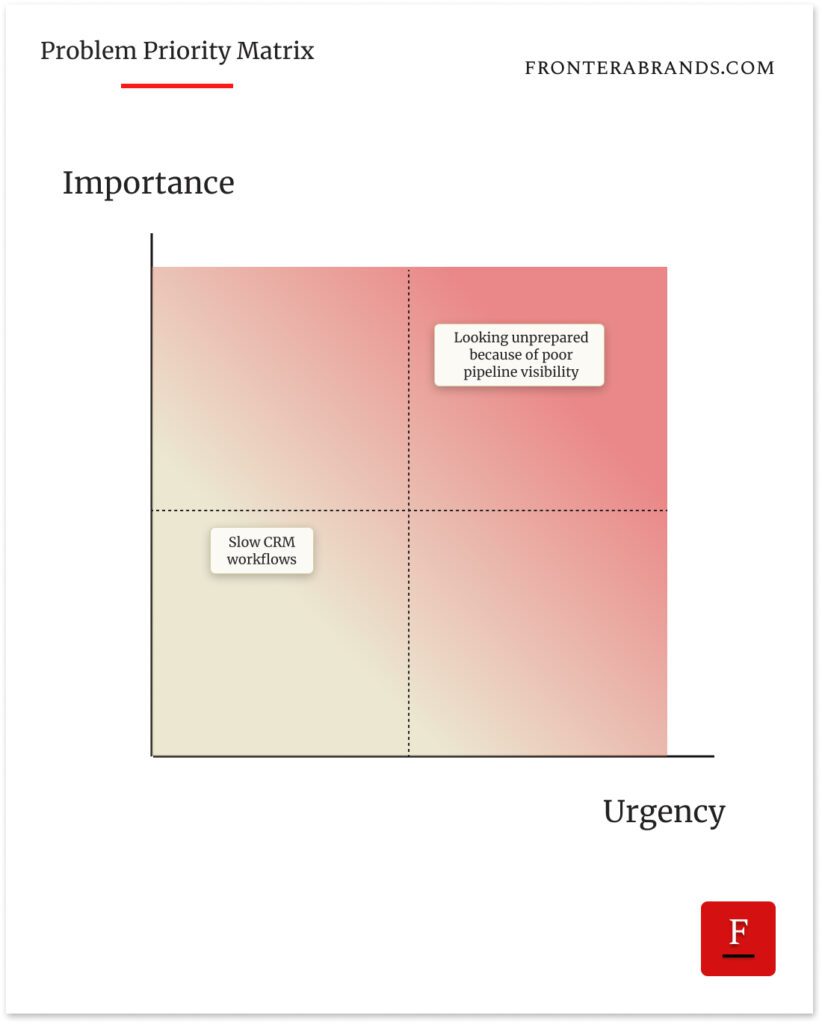 So even a single service can be tied to multiple client problems. It’s the same for your offers. And depending on which one you choose to message on, you can increase its priority in the eyes of the buyer. Then the question is: How can you know which one is more important to buyers? And how can you increase that problem’s urgency? So among their huge list of problems, they decide to spend their resources on your problem. Here are two ways: 1. Focus on emotional necessityLet’s unpack the word “importance.” What makes a problem important in the B2B context? Sure, every B2B offer boils down to making or saving money. But if you look a few layers deeper, the importance comes down to buyers’ emotional necessity. Which problem you solve threatens your buyer’s credibility, reputation, or future the most? Which problem causes the most annoyance? Let’s say you have an IT firm that does CRM improvements. You can message about the “your CRM workflows are clunky and slow” problem. Or you can message about “you look unprepared to your leadership team because of broken pipeline visibility.” The same service. Two different problems. Which one has more emotional necessity to fix? Which one would go higher on the buyers’ problem list? A VP of sales can live with a slow CRM workflow. Sure, he’d hear some complaints from his team every now and then. But it wouldn’t get him fired. So he might acknowledge that the problem exists, yet decide not to spend resources to fix it. But he cannot afford to look incompetent in front of leadership with inaccurate information about their sales pipeline. There is a higher emotional necessity to fix that problem. And that means that the buyer would be more likely to spend resources when the same service is framed that way.