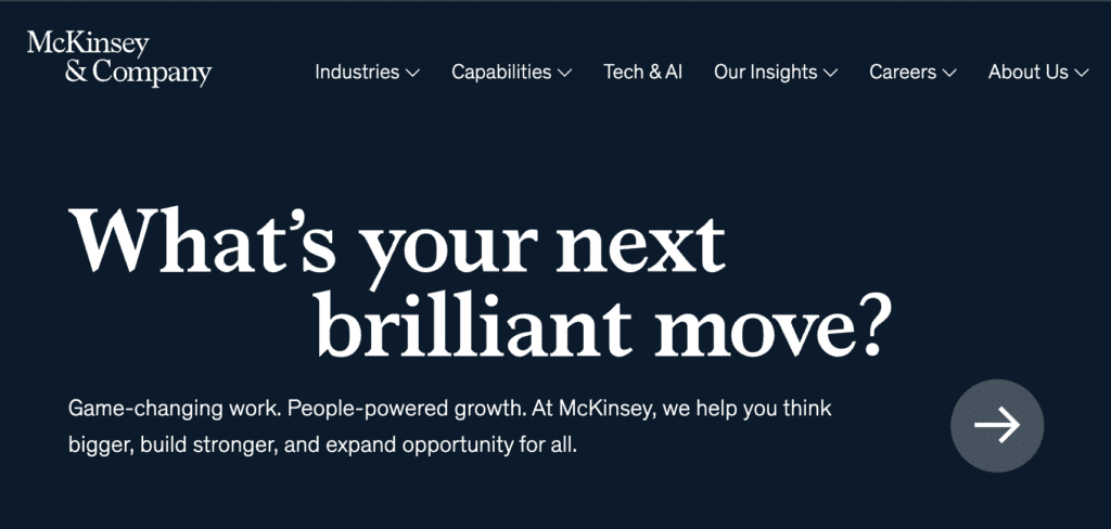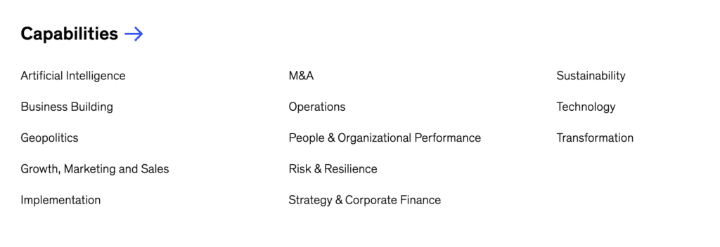 The more specific you get, the more relevant your firm becomes to a specific audience. They intuitively say: “This is for me.” So among dozens of other things trying to catch their attention, they have to click that one. And if they like what they see, they check your firm’s site and social profiles. If what they see there is also specific, they want more. Maybe they subscribe to your newsletter. Maybe they give you a follow on social media. That starts a chain of interactions where they eventually hire your firm. And compounding this specificity over time is what makes consulting firms an authority. But most boutique firms give up this weapon so early. They have the illusion that they have to add “ands” to their positioning to grow. Whether to their ideal client profile. Or to their services. But every “and” costs them specificity. Look at McKinsey’s site. They list dozens of industries and capabilities. Their website, content, and ads have to cater to hundreds of client problems and outcomes.